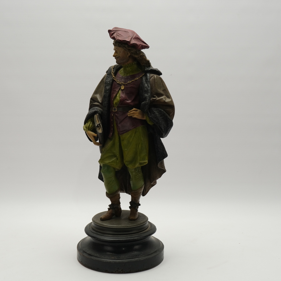 Een groot Frans 19e eeuws koud beschilderd metalen sculptuur van een edelman op houten sokkel.
