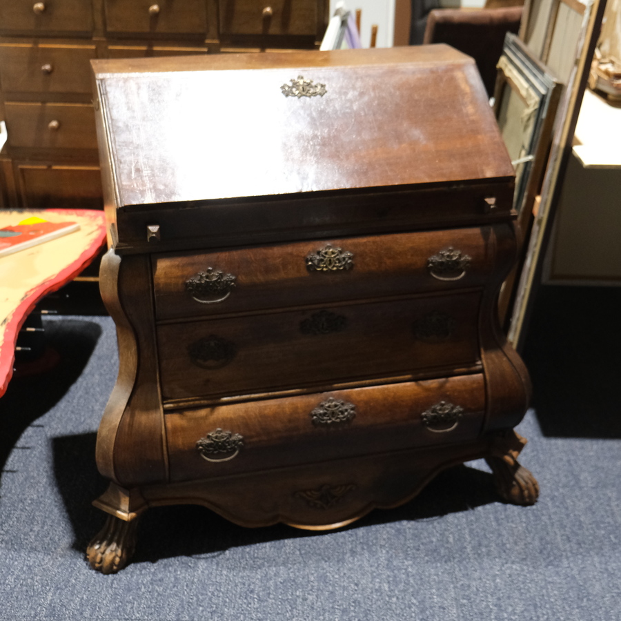 Een 19e eeuwse eikenhouten klepsecretaire met drie laden en kelder.