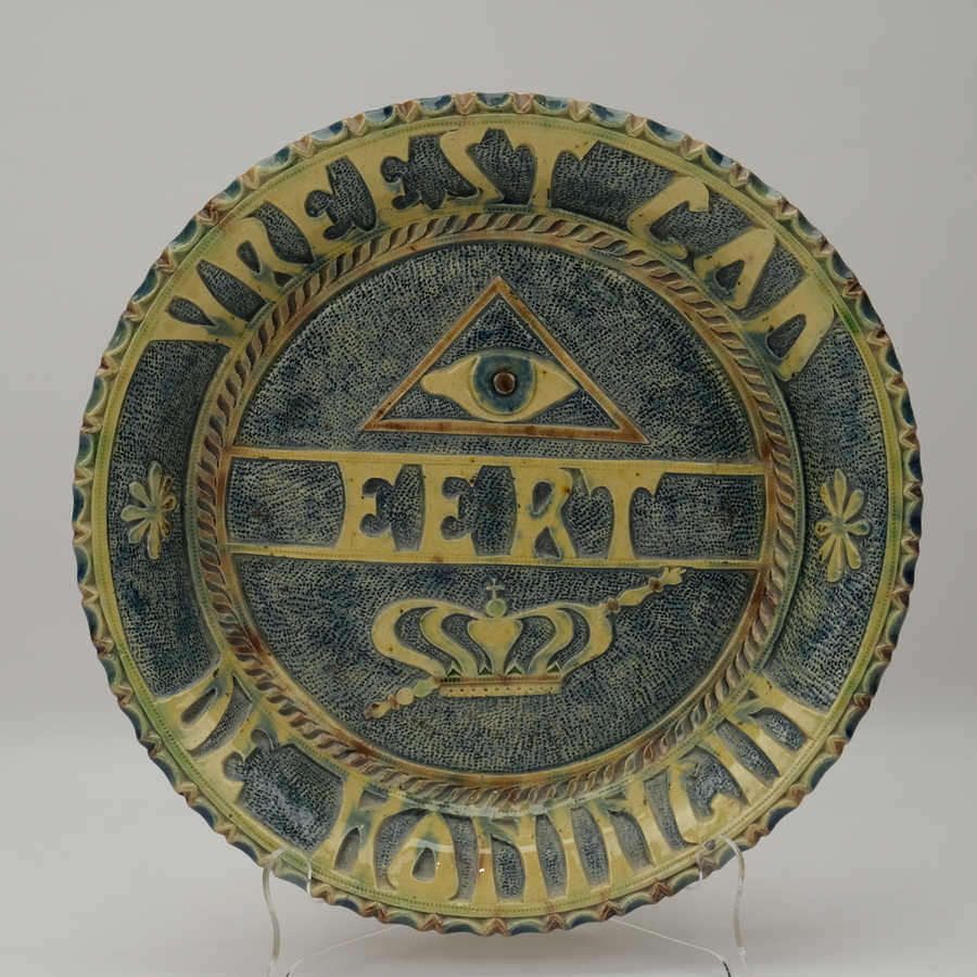 Fries kerfsnee aardewerken spreukschotel