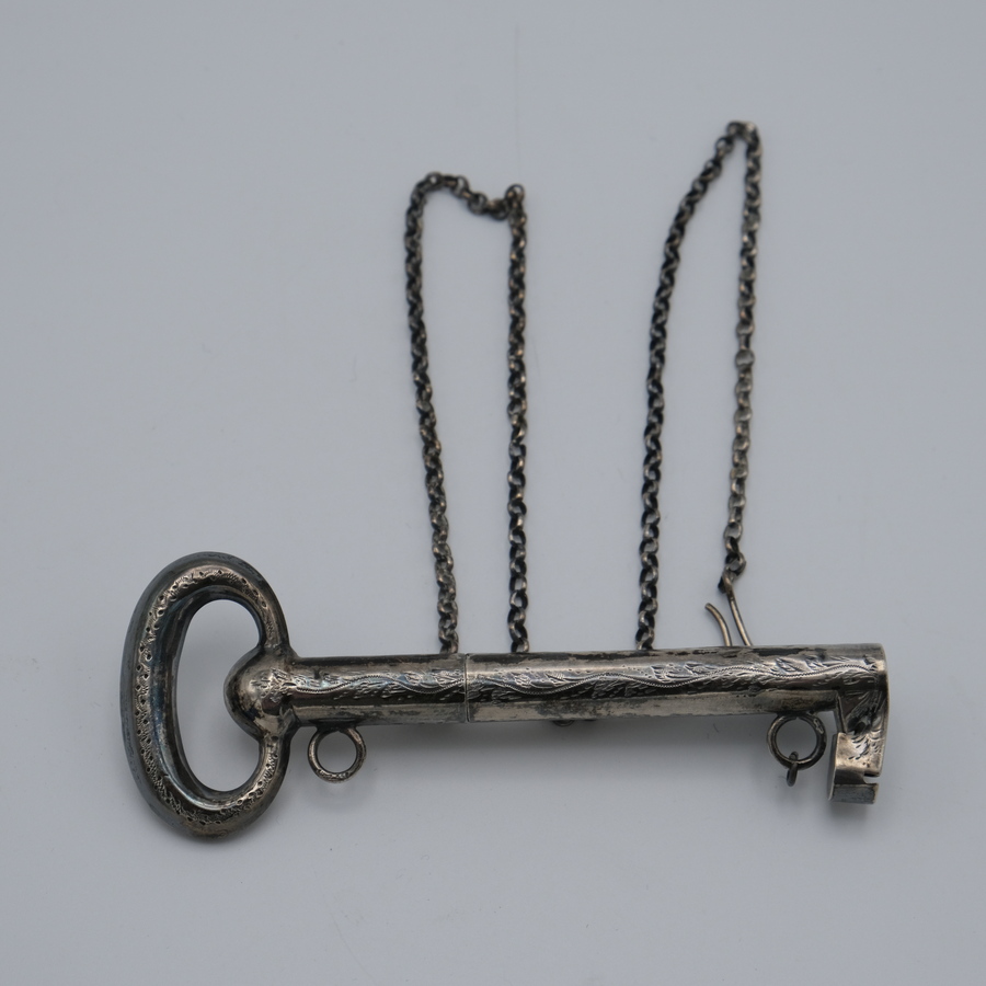 Twee 19e eeuwse tweede gehalte zilveren breipendoppen in de vorm van een sleutel
