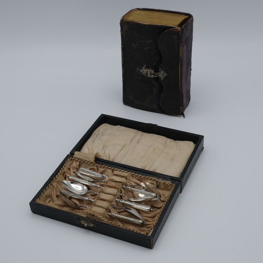 Een antieke bijbel, 1875, in fluwelen kaft met zilveren slot. Met daarbij een set van zes gegraveerde zilveren advocaatlepeltjes