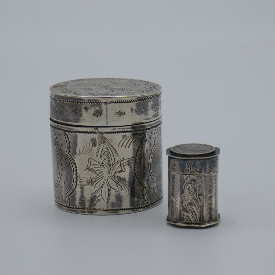 Lot van twee zilveren doosjes: een 20e eeuws gegraveerd ovaal lodereindoosje, gemerkt ZII. Met daarbij een 19e eeuws zilveren muntendoosje met op de bovenzijde een Willem III muntje