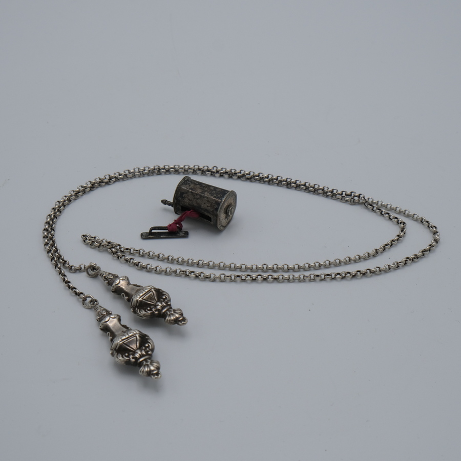 Set van 2 zilveren breipennendoppen aan zilveren jasseronketting. Met daarbij een 19e eeuws gegraveerd zilveren centimeterhoudertje