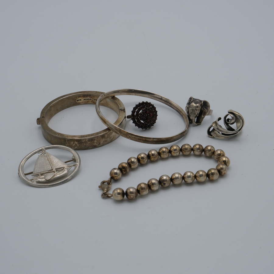 Lot diverse zilveren sieraden: drie eerste gehalte zilveren armbanden, drie ringen en een opengewerkte broche met voorstelling van een zeilschip