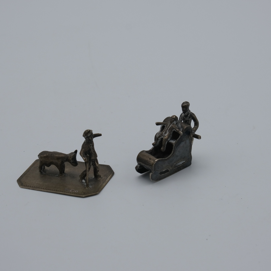 Lot van twee zilveren miniaturen: een herder met een koe en een kind in een duwslee