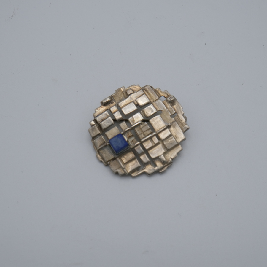 Een tweede gehalte (835/1000) zilveren broche in modernistische stijl, met blauwe steen. Gemerkt GB5