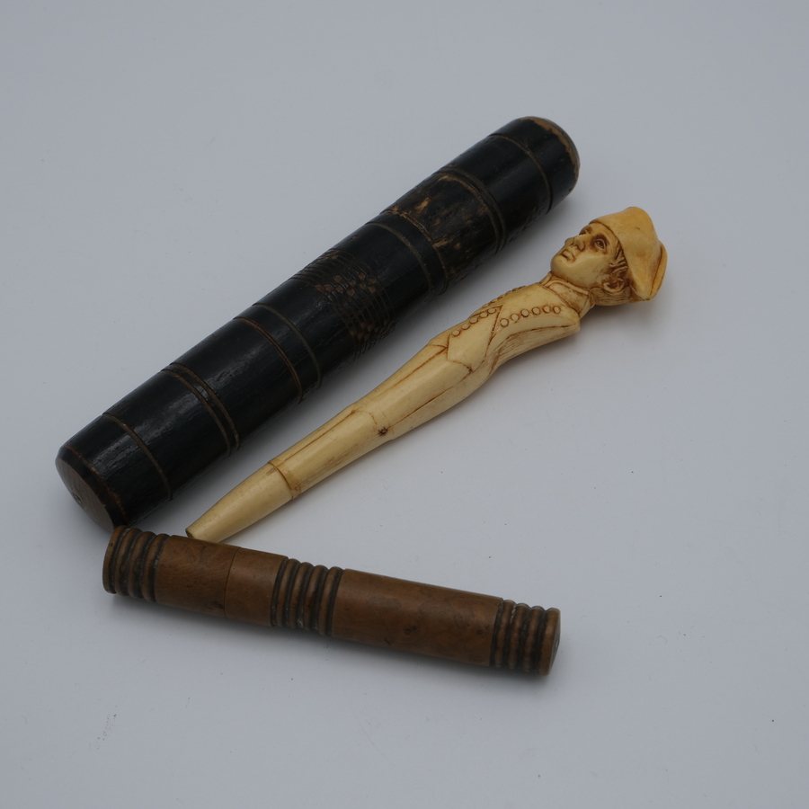 Lot van drie antieke naaldenkokers met naalden, waaronder één met buste van Napoleon