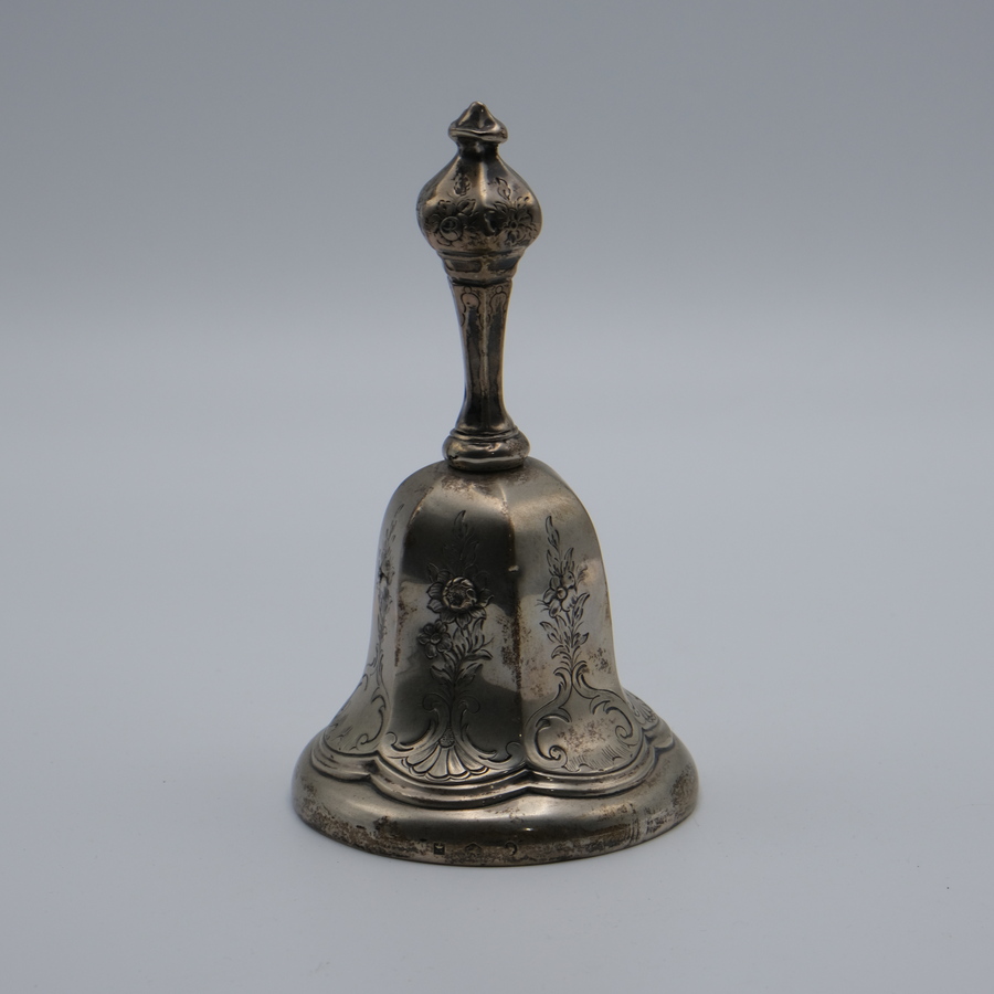 Een antieke 19e eeuwse tweede gehalte (835/1000) zilveren tafelbel met florale graveringen. Aan de binnenzijde een koperen bel en klepel, 20e eeuws. Zilver gemerkt Mr. J.H. Schmidt, Amsterdam 18...