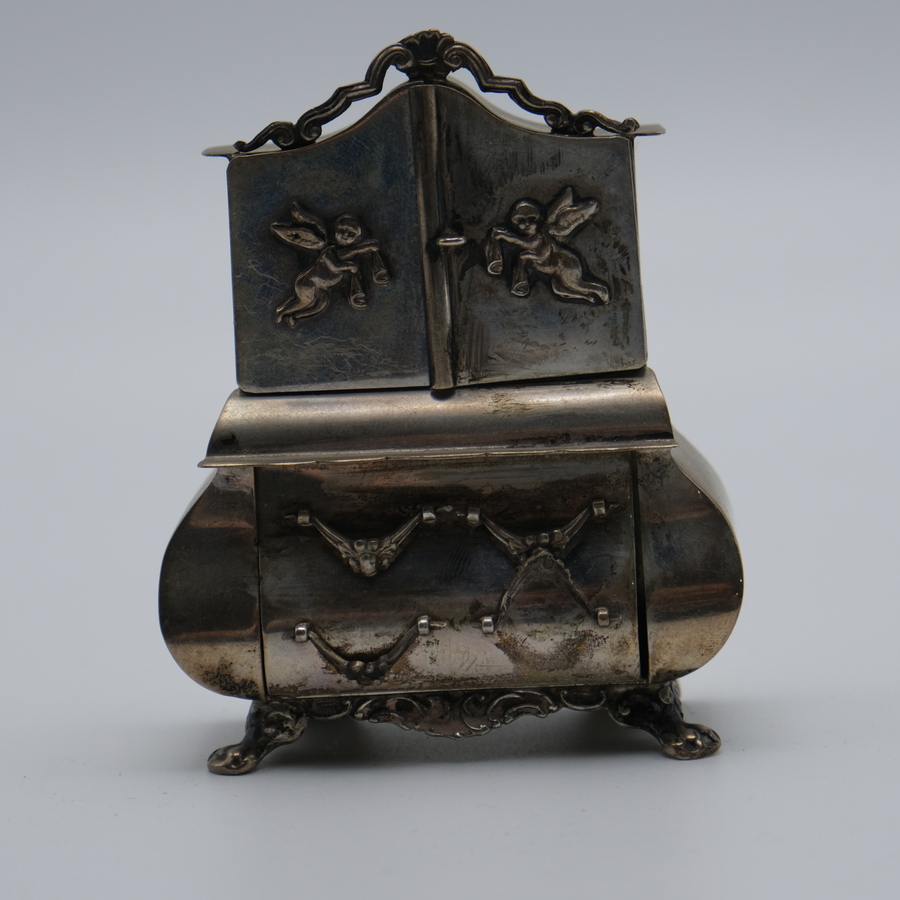 Een tweede gehalte (835/1000) zilveren miniatuurkabinetje met één laadje en twee openslaande deuren, versierd met engeltjes. Gemerkt Hooykaas, 1972.