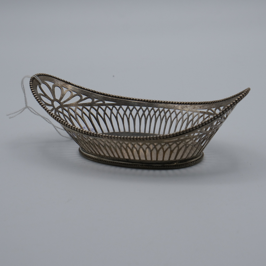 Een tweede gehalte (835/1000) zilveren ajour gezaagd bonbonmandje versierd met parelrand. Mr. Chr. JP de Ruiter, Den Haag 1916.