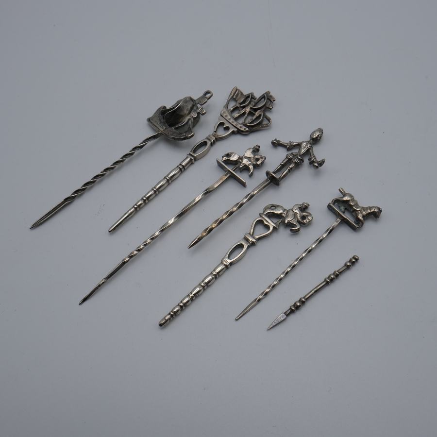Lot van zeven tweede gehalte (835/1000) zilveren pijpewroeters met verschillende steelbekroningen, waaronder twee met een driemaster en twee met een ruiter