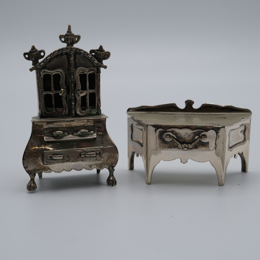 Lot van twee tweede gehalte (835/1000) zilveren miniatuur meubels, een kabinet en een ladenkastje