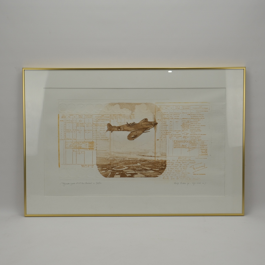 Kleurenets, in gouden lijst. Getiteld ‘fragmenten logboek Z.K.H. Prins Bernard in Spitfire’. Rechtsonder gesigneerd Leentje Linders (1942 -), gedateerd 1998.