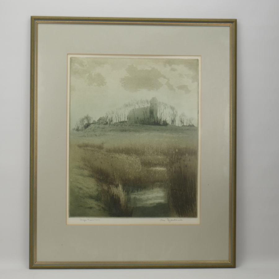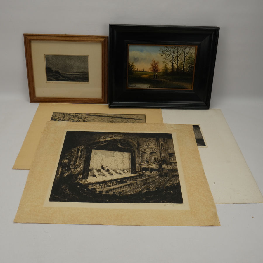 Lot diverse kunstwerken: een schilderij, olieverf op paneel. Met daarbij etsen van Murk Kuipers, Johan Hemkes, Jan Poortenaar en Jan Altink.