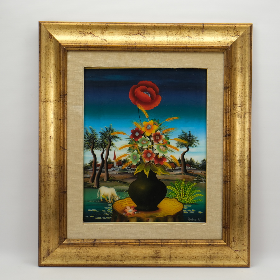 Achterglasschildering. Bloemstilleven in vergulde profiellijst, getiteld ‘Poppy’. Gesigneerd Jela Babec (Spanovic Lucijana, 1945). Herkomst: Westminster Fine Arts London