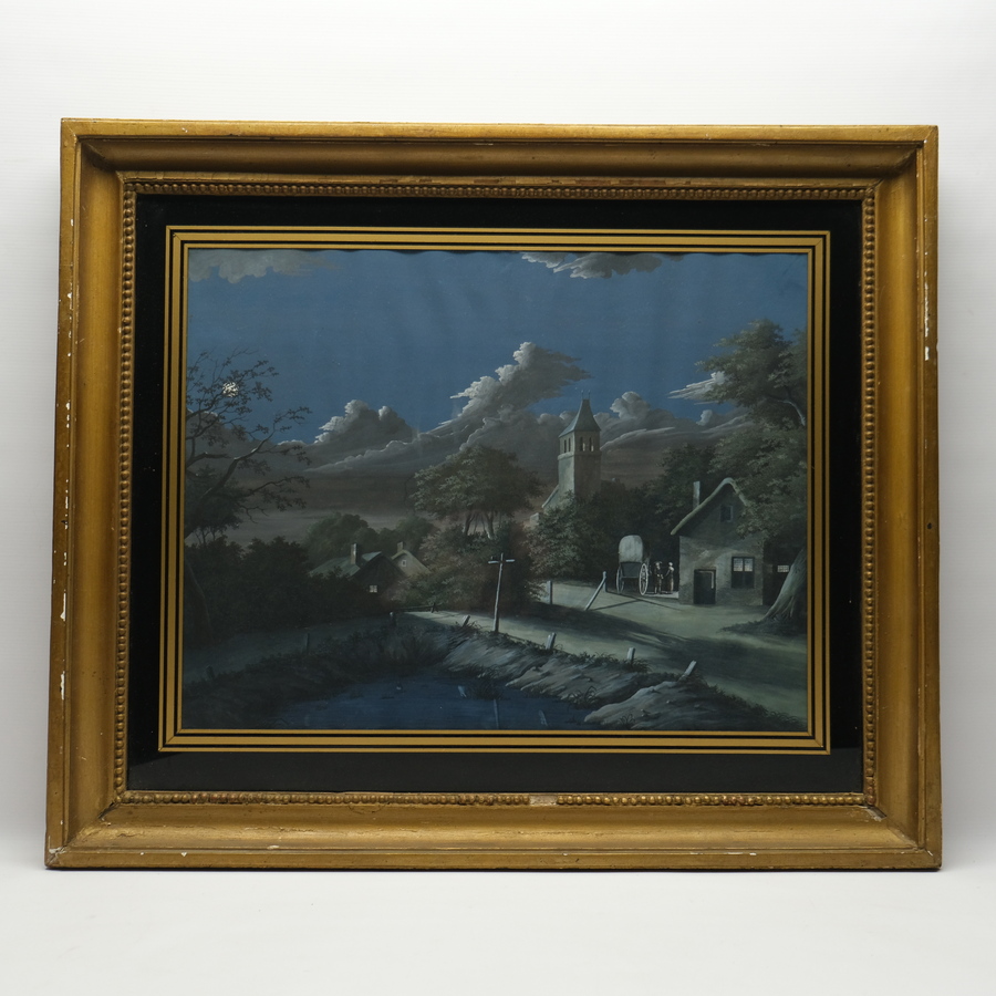 Een vroeg 19e eeuwse aquarel op papier. Landschap bij maanlicht dag met diverse figuren bij de kerk. Mogelijk Zwitsers, Tirol of Italiaans. Het werk zit nog in de originele lijst met glas passe...