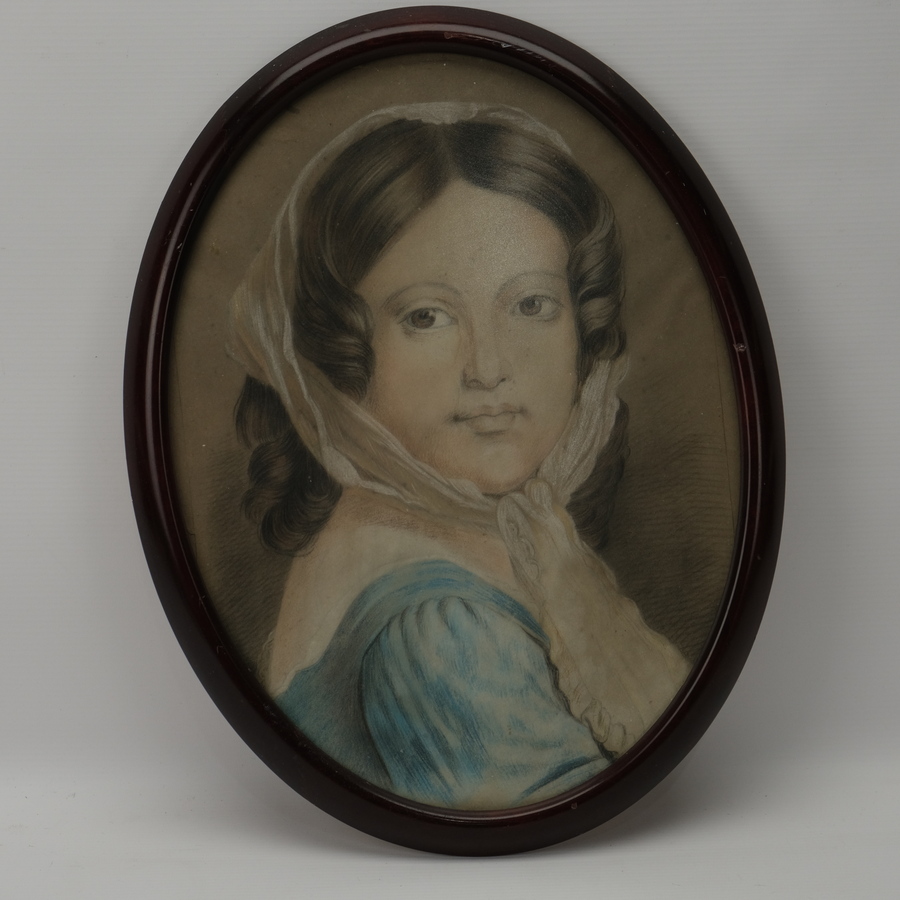 Antieke Biedermeier ovale gouache. Portret van een jonge dame in blauwe jurk. Ca 1830. Geen signatuur.