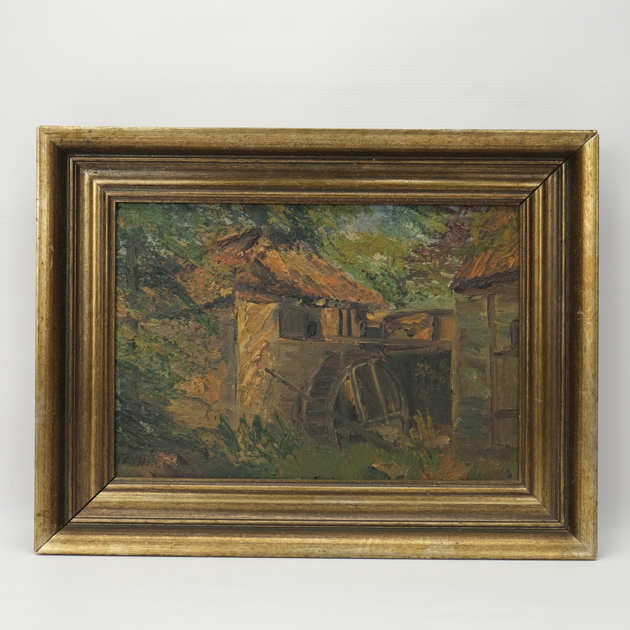 Schilderij, olieverf op doek. Voorstelling van een watermolen. Linksonder onduidelijk gesigneerd