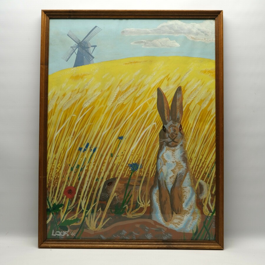 Schilderij plakaatverf op papier. Twee hazen in het korenveld met molen in de achtergrond. Gesigneerd LOUS '44 (= 1944). Mogelijk reclame ontwerp