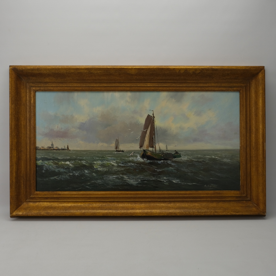 Schilderij, olieverf op doek. Zeilpraam op de Zuiderzee. Rechtsonder gesigneerd ‘Ferent’.
