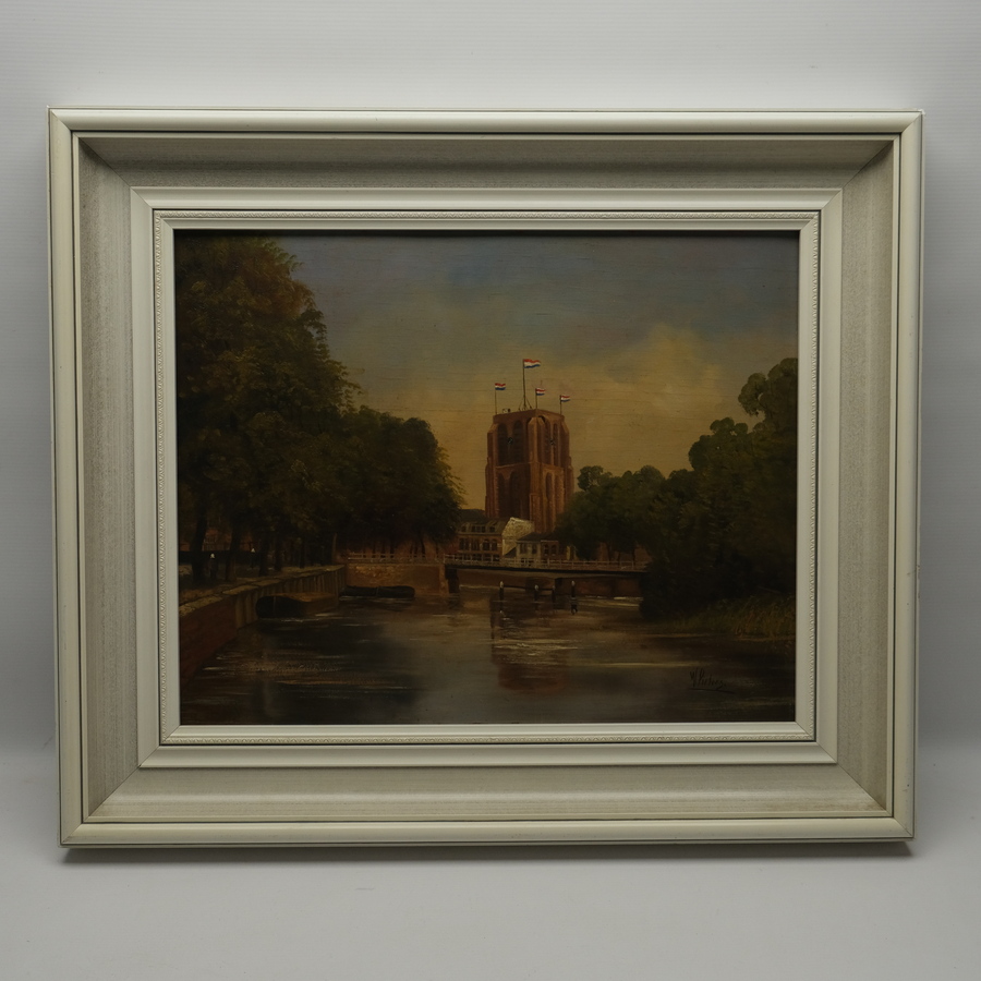 Schilderij, olieverf op paneel. Stadsgezicht van Leeuwarden met de Oldehove. Rechtsonder gesigneerd Pieters