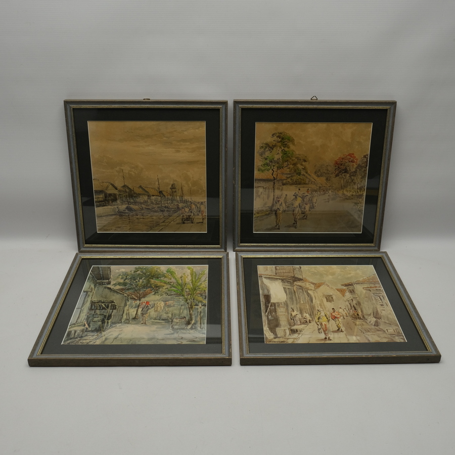 Vier aquarellen, in lijst. Voorstellingen van Indonesië, waaronder straatgezichten en een havengezicht. Linksonder gesigneerd Soewardja. Ca. 1900
