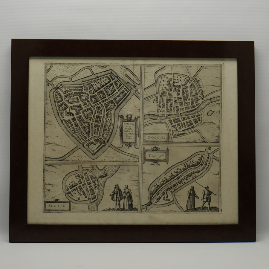 Kopergravure in lijst. Stadsplattegronden van Sneek, Dokkum, Sloten en IJlst. Door Braun & Hogenberg, eind 16e eeuw