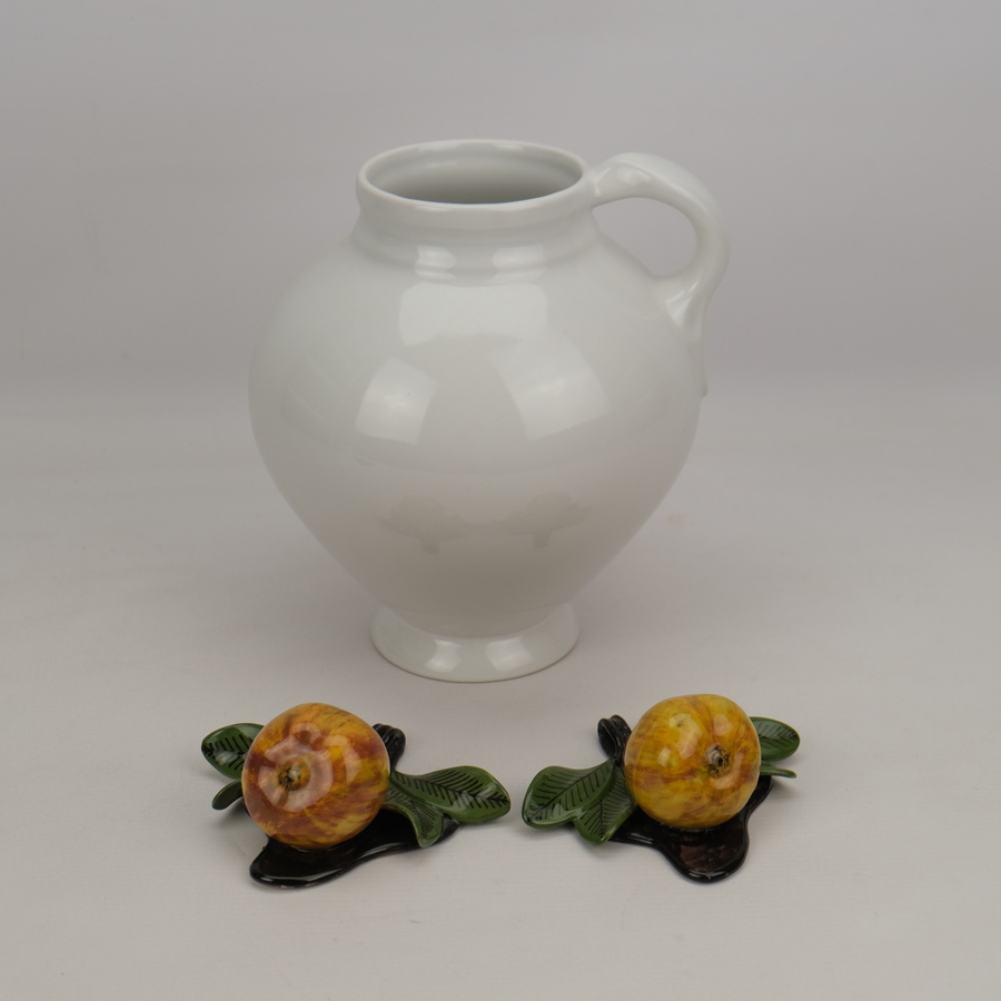Lot van drie stuks Tichelaar, waaronder een wit aardewerken schenkkan en twee polychroom beschilderde vormstukken, peren