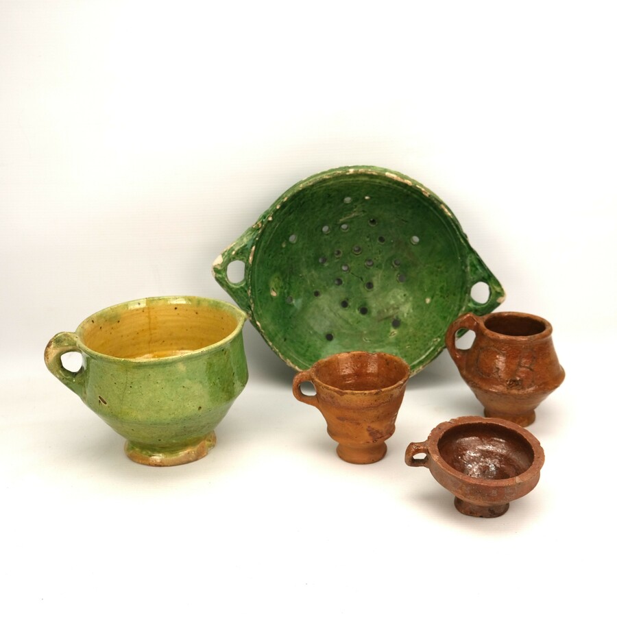 Lot van vijf stuks Fries aardewerk, waaronder een groengeglazuurd vergiet en een bruin aardewerken potje met initialen 'GB'