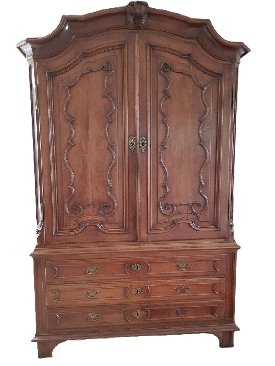 Een 18e eeuws Frans/Belgisch eikenhouten kabinet met Louis XV houtsnijwerk. Twee deuren, drie laden en gecontourneerde kap.