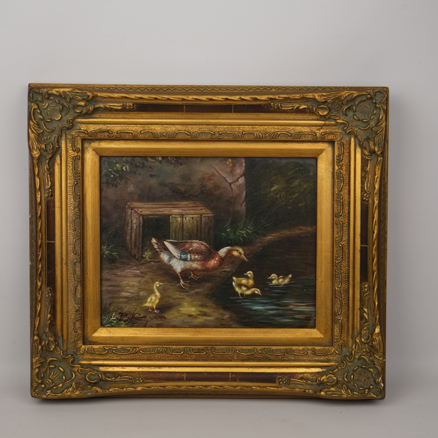Schilderij, olieverf op board, in gouden ornamentenlijst. Moeder eend met drie kuikens. Linksonder gesigneerd Braun. Herkomst: Hotel de Wijnberg, Bolsward.