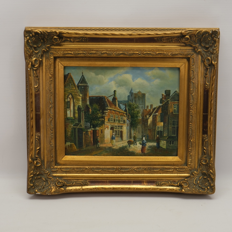 Schilderij, olieverf op board, in gouden ornamentenlijst. Stadsgezicht, gemonogrammeerd H.H.L. Herkomst: Hotel de Wijnberg, Bolsward.