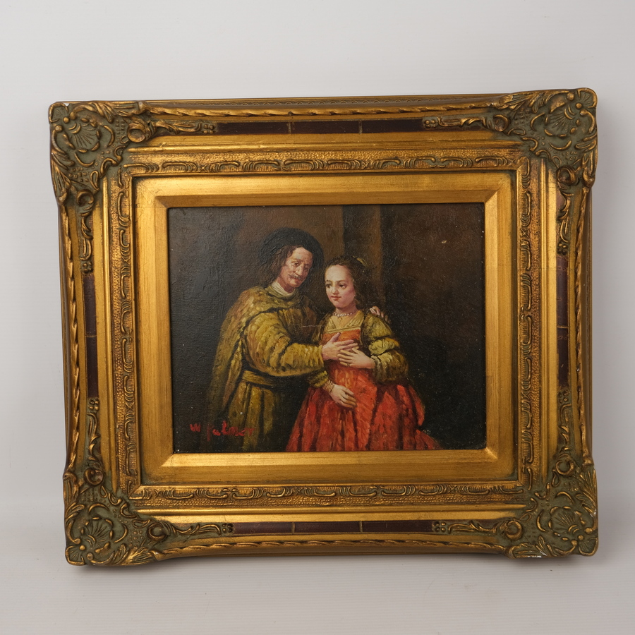 Schilderij, olieverf op paneel, in gouden ornamentenlijst. Man en vrouw, naar het Joodse Bruidje van Rembrandt. Linksonder gesigneerd W. Palnier. Herkomst: Hotel de Wijnberg, Bolsward.