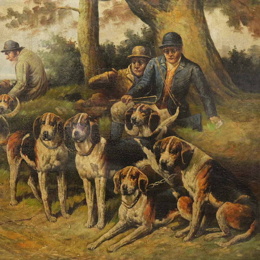 Schilderij, olieverf op doek. Drie wachtende Engelse jagers met jachthonden. Ongesigneerd. Herkomst: Hotel de Wijnberg, Bolsward.