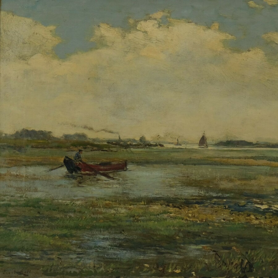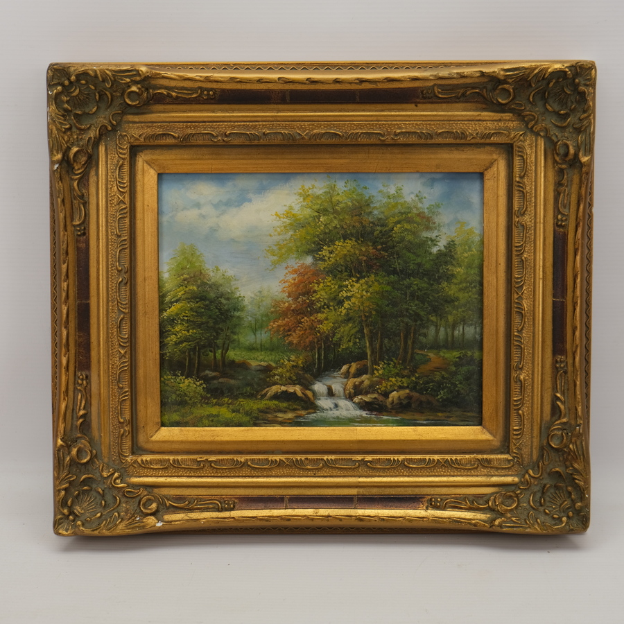 Schilderij, olieverf op board, in gouden ornamentenlijst. Landschap met bomen en rivier. Ongesigneerd. Herkomst: Hotel de Wijnberg, Bolsward.