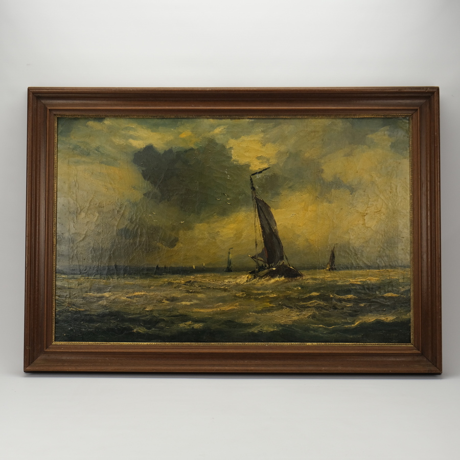 Schilderij olieverf op doek. Zeilende schepen op het open water. Naar Mesdag.