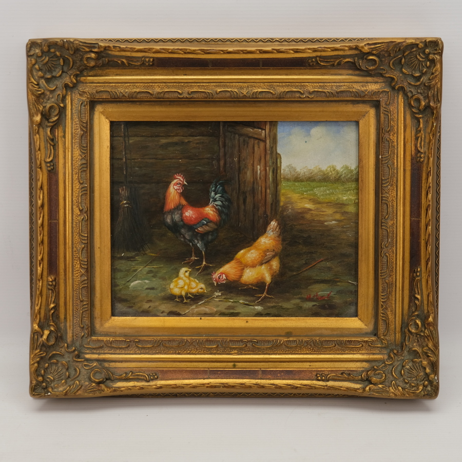 Schilderij, olieverf op board, in gouden ornamentenlijst. Haan, kip en twee kuikens bij een schuur. Rechtsonder gesigneerd H.Hart. Herkomst: Hotel de Wijnberg, Bolsward.