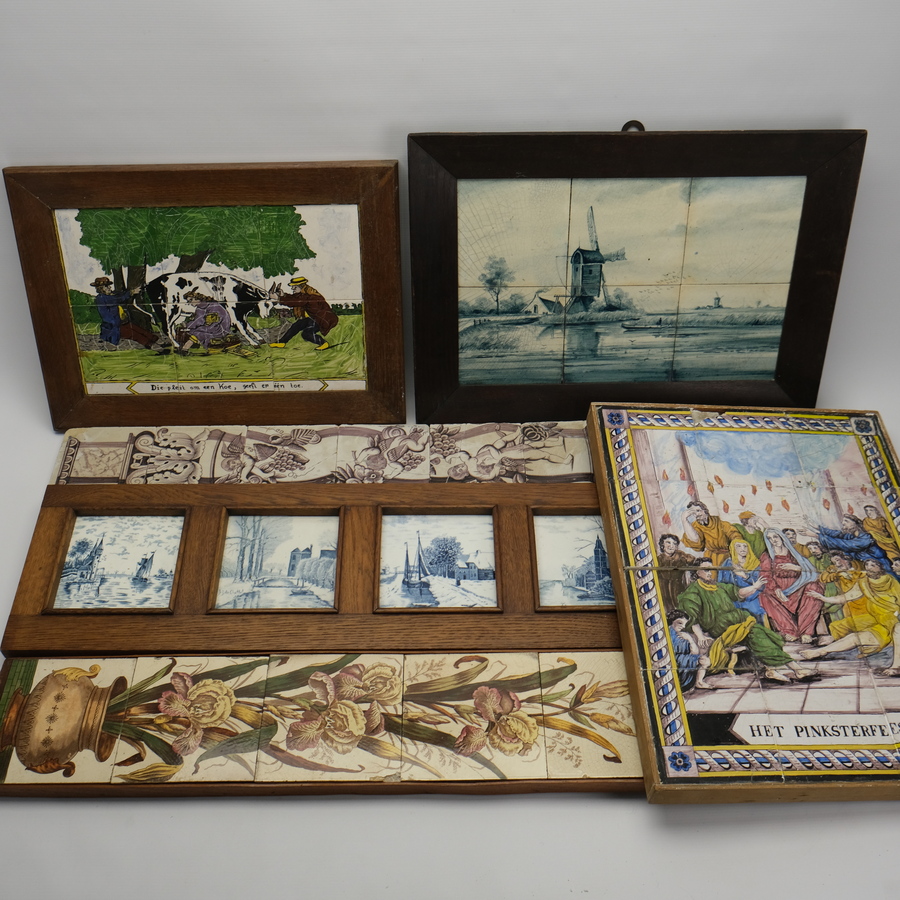 Lot diverse tegeltableaus met afbeeldingen van o.a. een visser op het water bij een spinnenkopmolen, boeren bij een koe, Pinksterfeest, landschappen, bloemstilleven en putti's