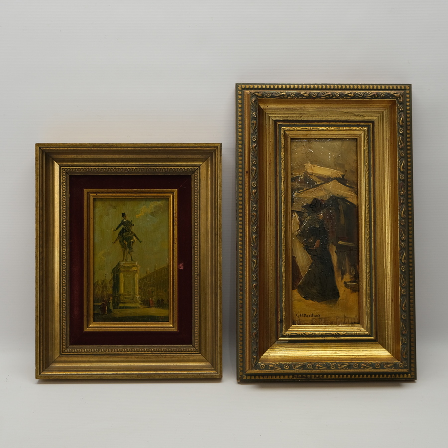 Lot van twee schilderijen, olieverf op paneel. Eén met voorstelling van een standbeeld, één met voorstelling van een dame, valselijk gesigneerd G.H. Breitner.