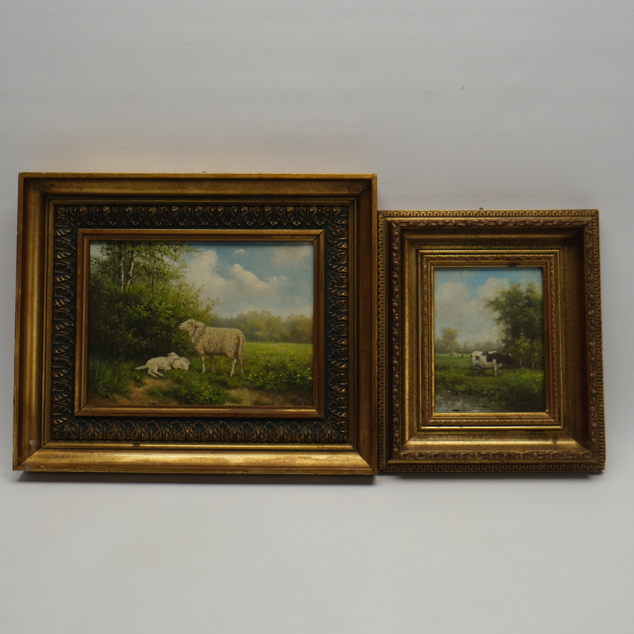 Lot van twee schilderijen. Melkende koe bij boer, ges. J.P. van Galen en schaap met lammetjes in de wei, onduidelijk gesigneerd