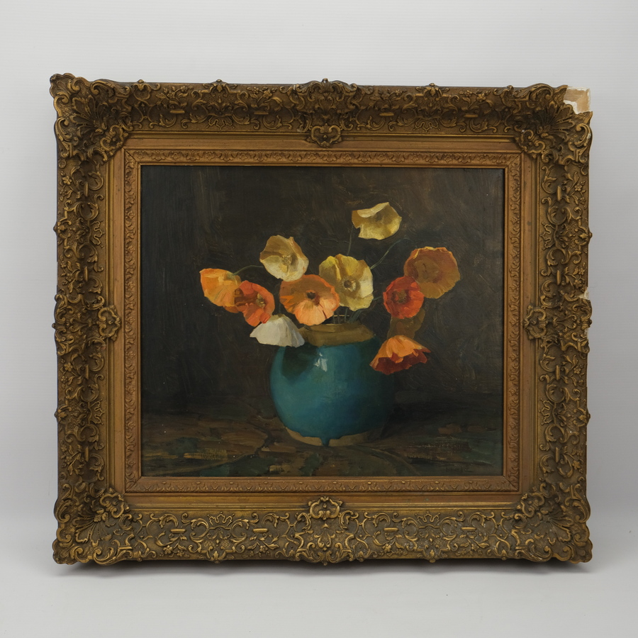 Schilderij, olieverf op doek, in gipslijst. Papavertjes in een gemberpot. Rechtsonder gesigneerd Jan Tiele (Utrecht 1884 - Arnhem 1956)