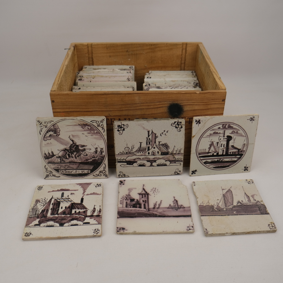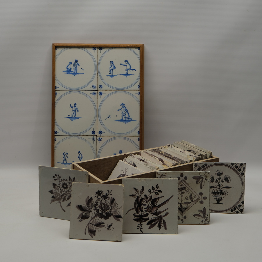Een lot diverse tegels: zes blauw-witte tegels met decor van kinderspelen en een kistje gevuld met diverse 18e en 19e eeuwse mangaan tegels