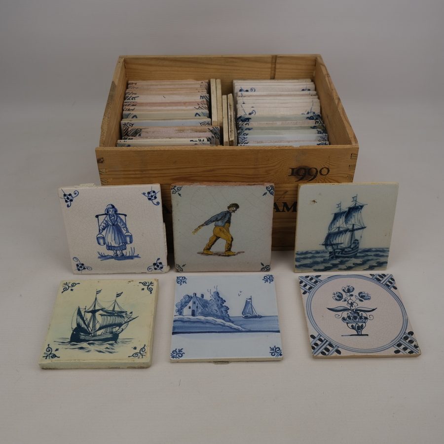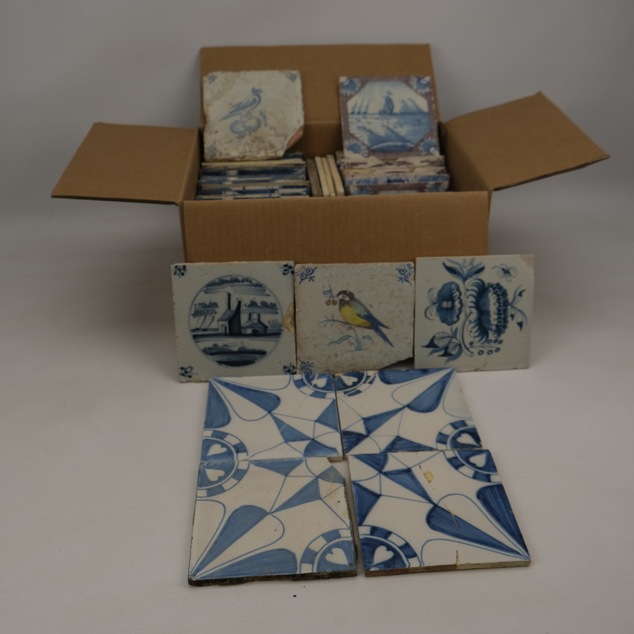 Doos gevuld met diverse tegels, waaronder antiek