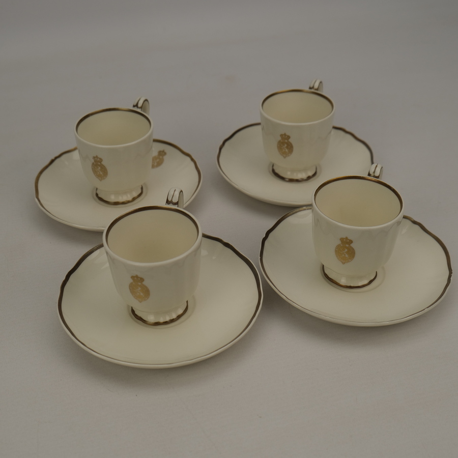 Set van vier porseleinen kop en schotels met gouden bies en logo van de Tweede Kamer der Staten-Generaal. Gemerkt Petrus Regout, Maastricht. Verkocht door R.A.W. Philippona, Den Haag