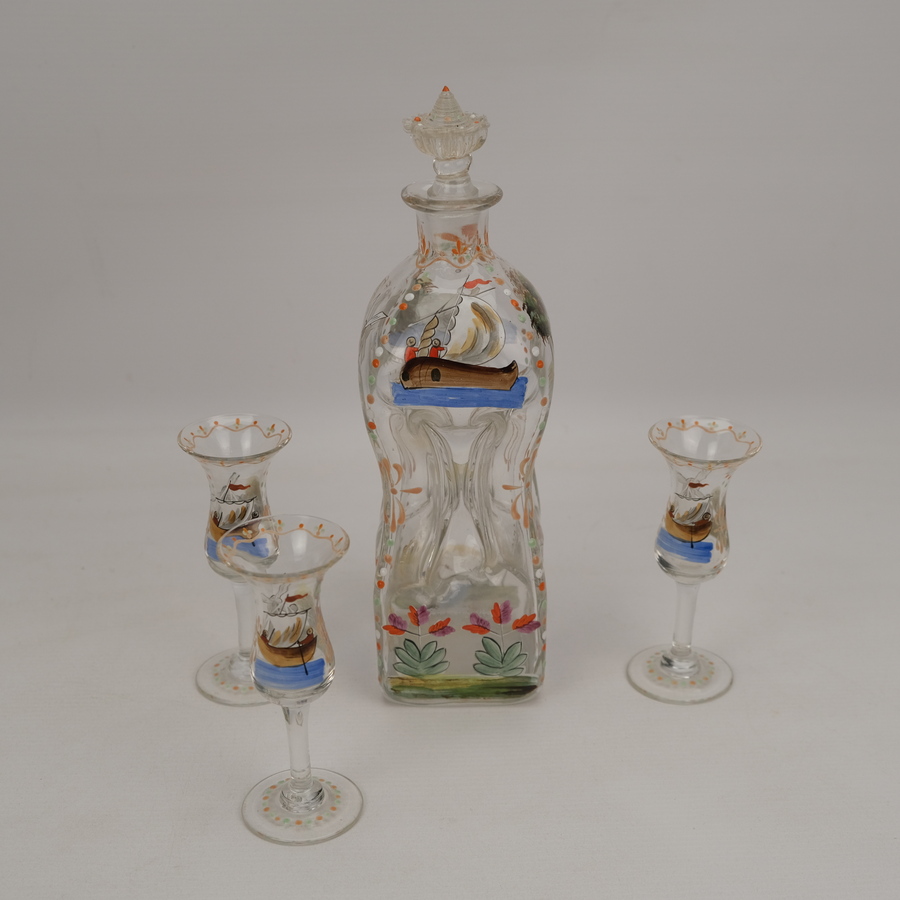 Een antieke 19e eeuwse Nederlandse kristallen karaf met emaillebeschildering, voorstelling van molens en schepen. Model staat ook wel bekend als 'Kluk kluk' of 'Kuttrolf' karaf.
