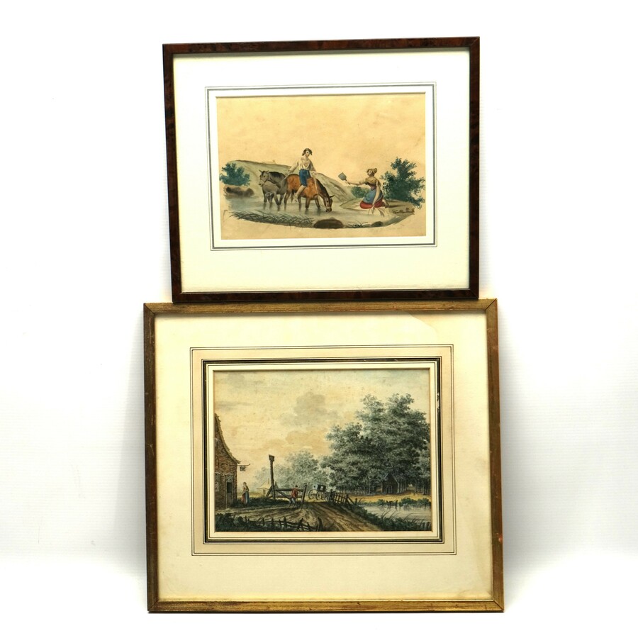 Lot van twee 19e eeuwse aquarellen: één met voorstelling van ruiter met twee paarden in het water, ges. A.J.J. Sierens (?), en één met voorstelling van twee figuren bij een herberg, onduidelijk ...