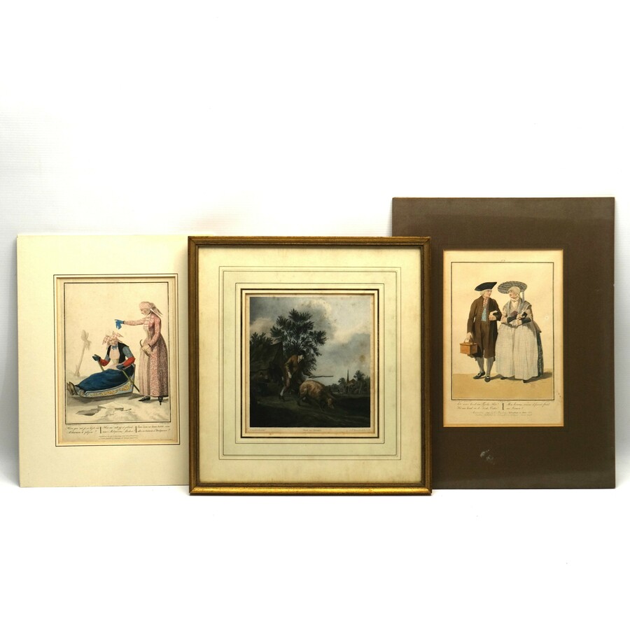 Twee 19e eeuwse gravures: één met voorstelling van twee dames in Friese klederdracht en tekst 'Herre Goe! Sel ji so klijd nei Molkoerum to pikjen?'. Met daarbij één met voorstelling van Fries vi...