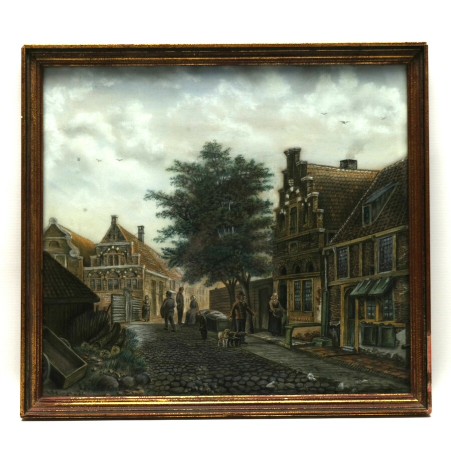 Gemengde techniek, 19e eeuw. Stadsgezicht met diverse figuren, waaronder een vrouw met oorijzer en man met hondenkar. Ongesigneerd