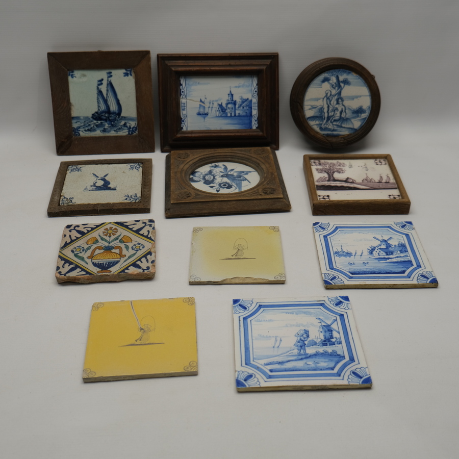 Lot van twaalf tegels, blauw-wit, mangaan en polychroom. O.a. een 17e eeuwse tegel met bloemenvaas en twee 18e eeuwse tegels met voorstelling van zeilschip en Adam & Eva