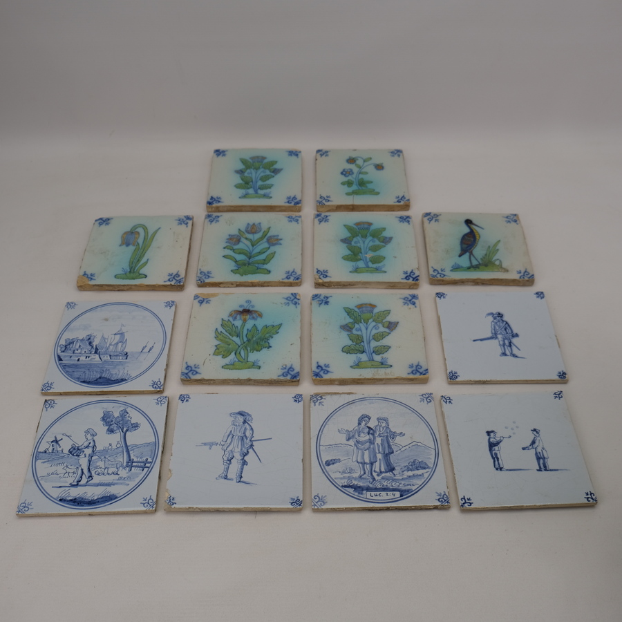 Lot van veertien tegels: zes blauw-witte tegels, diverse voorstellingen en 8 acht tegels met polychroom decor van bloemen. 19e/20e eeuw.